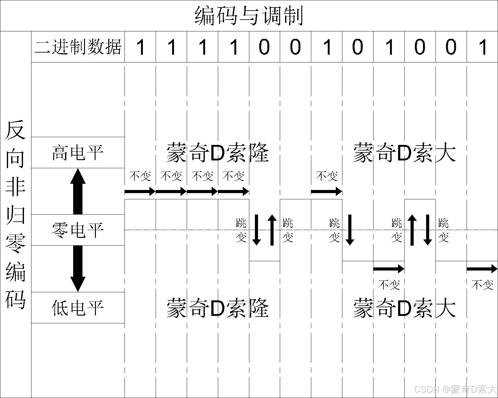 - 反向归零( N R Z I ( N o n e _ R e t u r n _ t o _ Z e r o _ I n v e r t e d ) NRZI(None\_Return\_to\_Zero\_Inverted) NRZI(None_Return_to_Zero_Inverted))编码 :与 N R Z NRZ NRZ 编码的区别是用电平的跳变表示 0 0 0 、电平保持不变表示 1 1 1 。