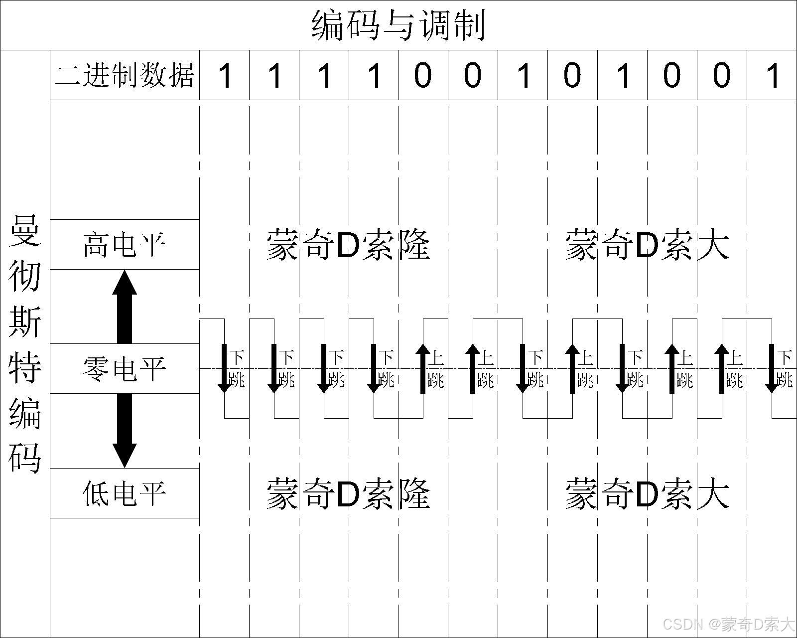 上图所示的就是曼彻斯特编码,我们需要注意该编码的跳变规则:下跳为 1 1 1 ,上跳为 0 0 0(或者相反)。