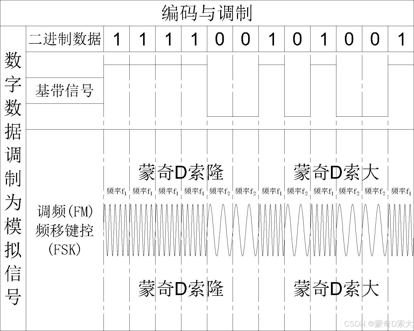 - 调频( F M FM FM)或频移键控( F S K FSK FSK)。通过改变载波的频率来表示数字信号 1 1 1 和 0 0 0 。