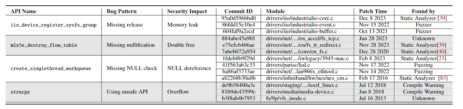时间和安全影响 :如表1所示,RPB可以出现在同一模块中,也可以跨多个模块,并可能是单个开发者或多个开发者在一段时间内的贡献结果。模块化的维护使得由于缺乏对相关补丁的意识和复杂的依赖关系,识别和修复RPB变得困难。此外,尽管大型项目定期执行编码标准,但开发者的多样性不可避免地导致了代码库中的一些差异,从而增加了RPB发生的概率。一旦引入,可能是由于新的调用或API的变化,它可能会长时间得不到解决。例如,宏create_singlethread_workqueue分配一个工作队列,在失败时返回NULL,其返回值必须检查以避免NULL解引用。根据补丁历史,我们发现跨越七年的四个补丁(从2016年到2023年)修复了多个驱动程序中未保护使用该宏的问题。现有检测方法的局限性通常只能揭示一些孤立的RPB实例。模糊测试(Fuzzing),在我们研究的13个补丁中的四个补丁中使用,只修复了触发的问题,而不是内核中的所有问题。此外,RPB会导致广泛的安全后果。如表1所示,它们可能表现为内存泄漏 、NULL指针解引用 、引用计数泄漏 、使用后释放错误 和缓冲区溢出等。