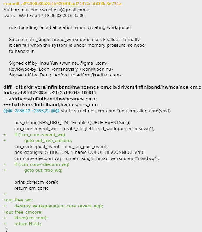 发生的容易性 :一个单一的错误是否最终成为RPB,取决于三个因素:(1)错误使用的API或代码片段被调用的次数,(2)它多容易被错误使用,以及(3)如果存在防护措施,开发人员是否能一致地应用这些措施。以宏create_singlethread_workqueue为例,图1中展示了一个补丁。这个宏在失败时可能返回NULL。因此,补丁添加了缺失的防护措施:检查返回的指针是否为NULL,并执行必要的清理。然而,这个宏在Linux内核中被调用超过197次,并且并不是每次调用都有适当的防护。我们对Linux内核补丁历史的审查发现了16个独立的修复,其中四个在表1中有所突出,修复了遗漏该防护措施的调用点,避免了NULL指针解引用。在某些情况下,某些API更容易出错,这使得这些API的RPB更常见。例如,尽管pm_runtime_get_sync函数在内核中仅被调用了几百次,但它仍然引入了超过九十个错误。该函数无条件地增加其内部引用计数,偏离了资源获取API通常的"成功时增加"的模式。这种偏离常常导致开发人员未能减少相应的引用计数。