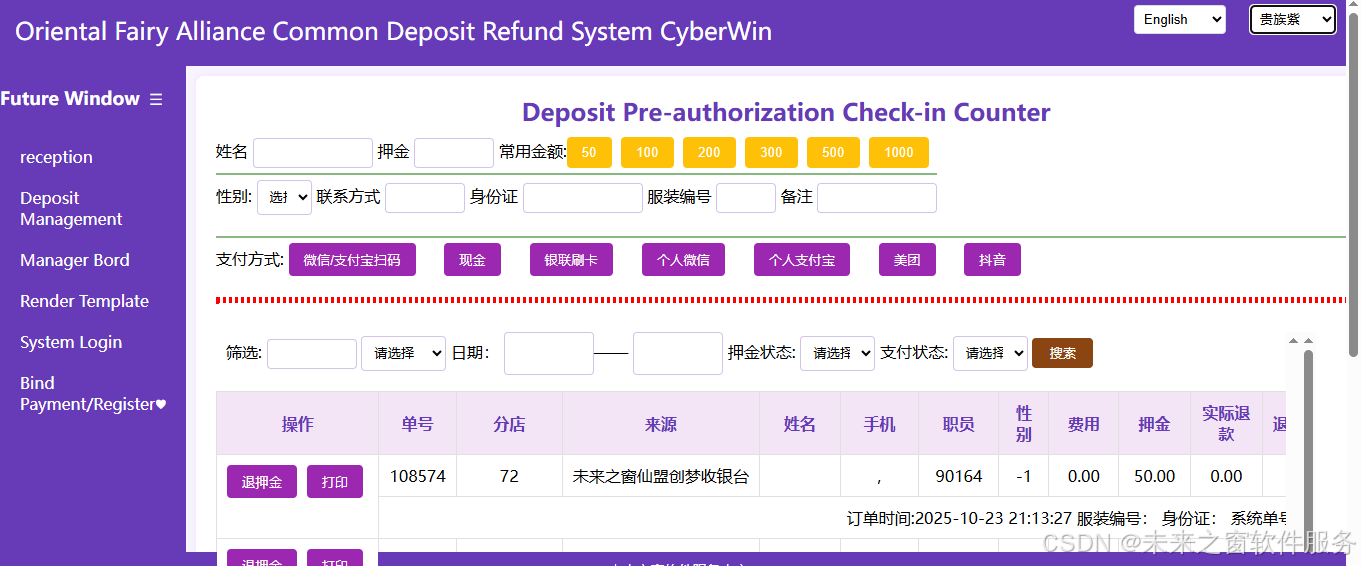 - 场景需求:国际展会中,外国参展商租赁展示道具需交押金,工作人员需用外语界面操作,支持国际通用支付方式(如银联刷卡)。