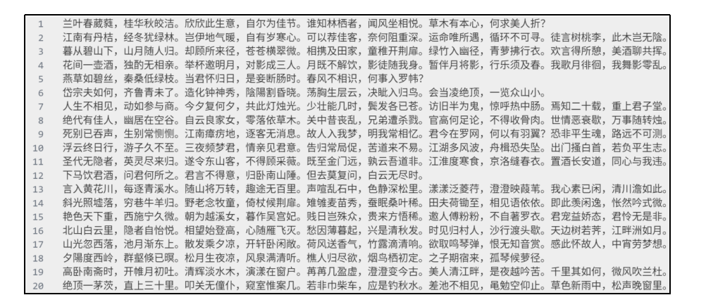 # start_token表示输入数据,line_num表示生成四句话,一句话有两个诗,中间有逗号,line_length表示每句话的长度