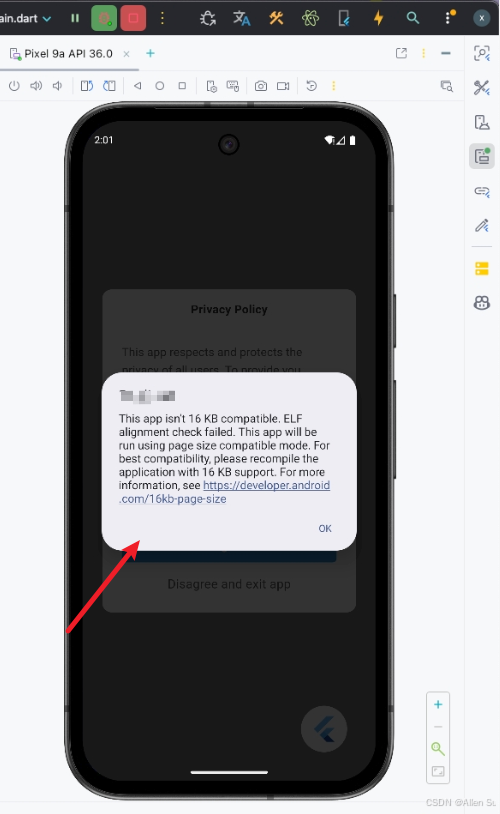 模拟器建好后,运行项目,如果你的应用不支持 16 KB 内存页面,应用启动时会出现下图所示情况