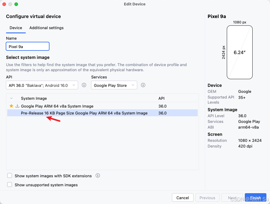 所以最好有一种方式可以模拟 16 KB 内存页面大小的环境来验证应用是否支持。谷歌 官方文档 中也给出了思路,这里我使用基于 16 KB 的 Android 16 系统映像设置 Android 模拟器来验证,如下图所示