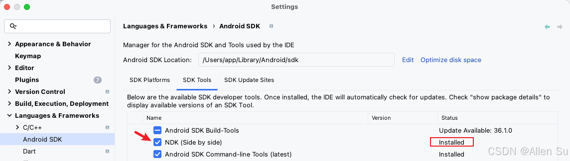 如果你的 NDK 版本也不高,左侧红色箭头所指之处此时应该显示的是一个横杠,右侧红色方框应该提示要升级的 NDK 版本号(如我的 29.0.14206865),因为我已经安装过了,所以这里显示了 Installed,自己点击安装即可。