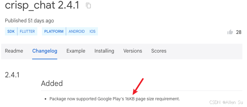 依次排除了 lottie: 3.2.0、cached_network_image: 3.4.1、extended_image: 9.1.0,最终在注释掉第 4 个插件 crisp_chat: 2.2.5 的时候,提示不支持的情况消失。去 crisp_chat 插件中查看更新日志,发现插件在 51天前发布的 2.4.1 版本已经修复了此问题,如下截图所示