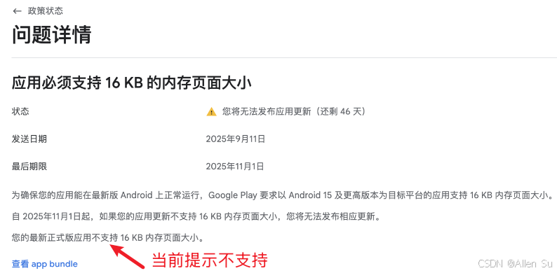 在政策状态的问题详情中,谷歌给出了当前应用是否支持的提示,如下图所示