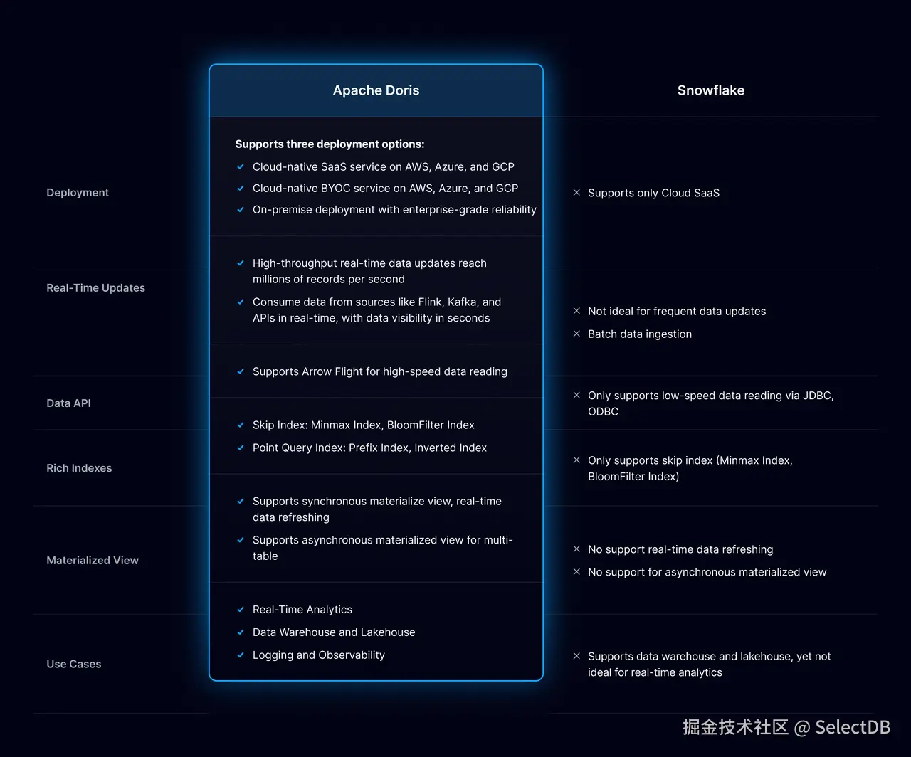 综上所述,以上对比清晰印证,Apache Doris 的综合表现不仅全面契合选型标准,更远超预期需求。基于其在成本可控性、性能稳定性及生态适配性上的突出优势,他们迅速决策将数据架构从 Snowflake 迁移至 Apache Doris,以应对高并发与实时性挑战。
