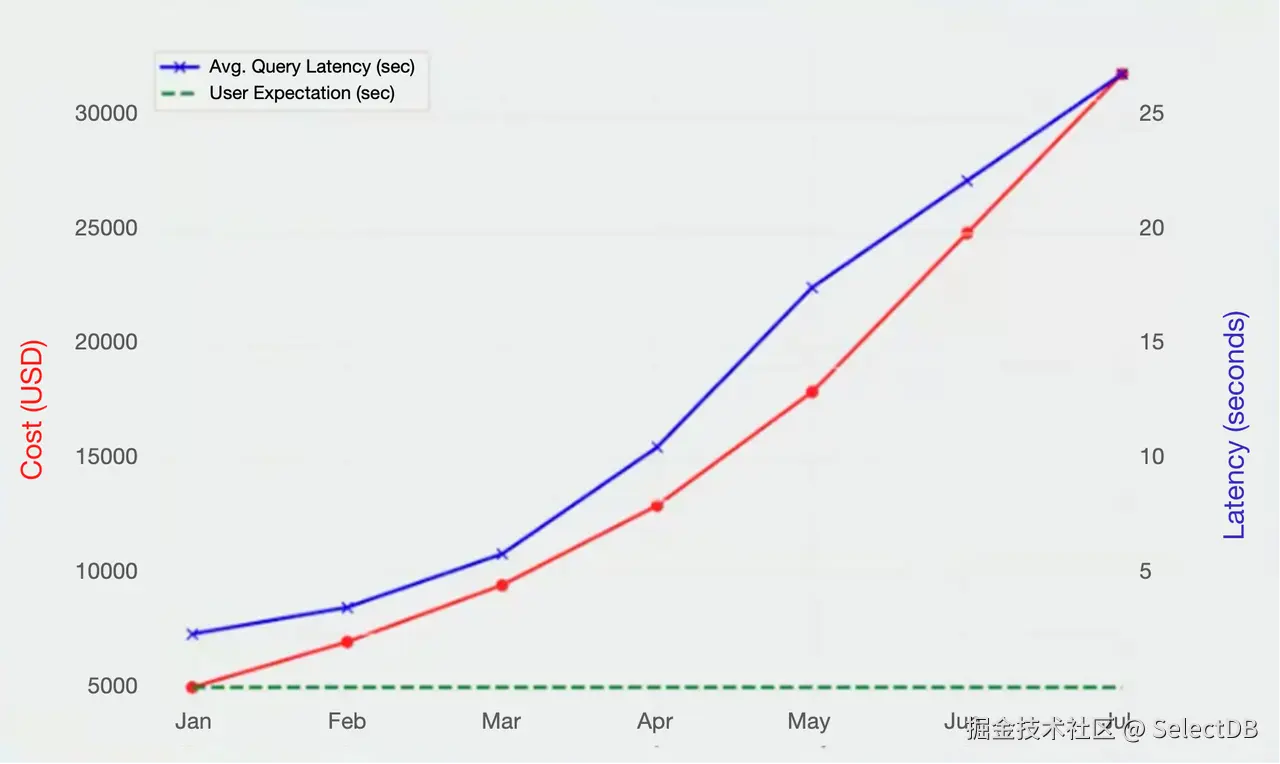 第一张折线图清晰呈现了从一月到七月期间,月度成本(红色曲线)和平均查询延迟(蓝色曲线)的持续攀升趋势:成本从 5,000 美元迅速上涨至 32,000 美元,而查询延迟也从 5 秒飙升至 26 秒,远超用户期望的 3 秒阈值(绿色虚线)。