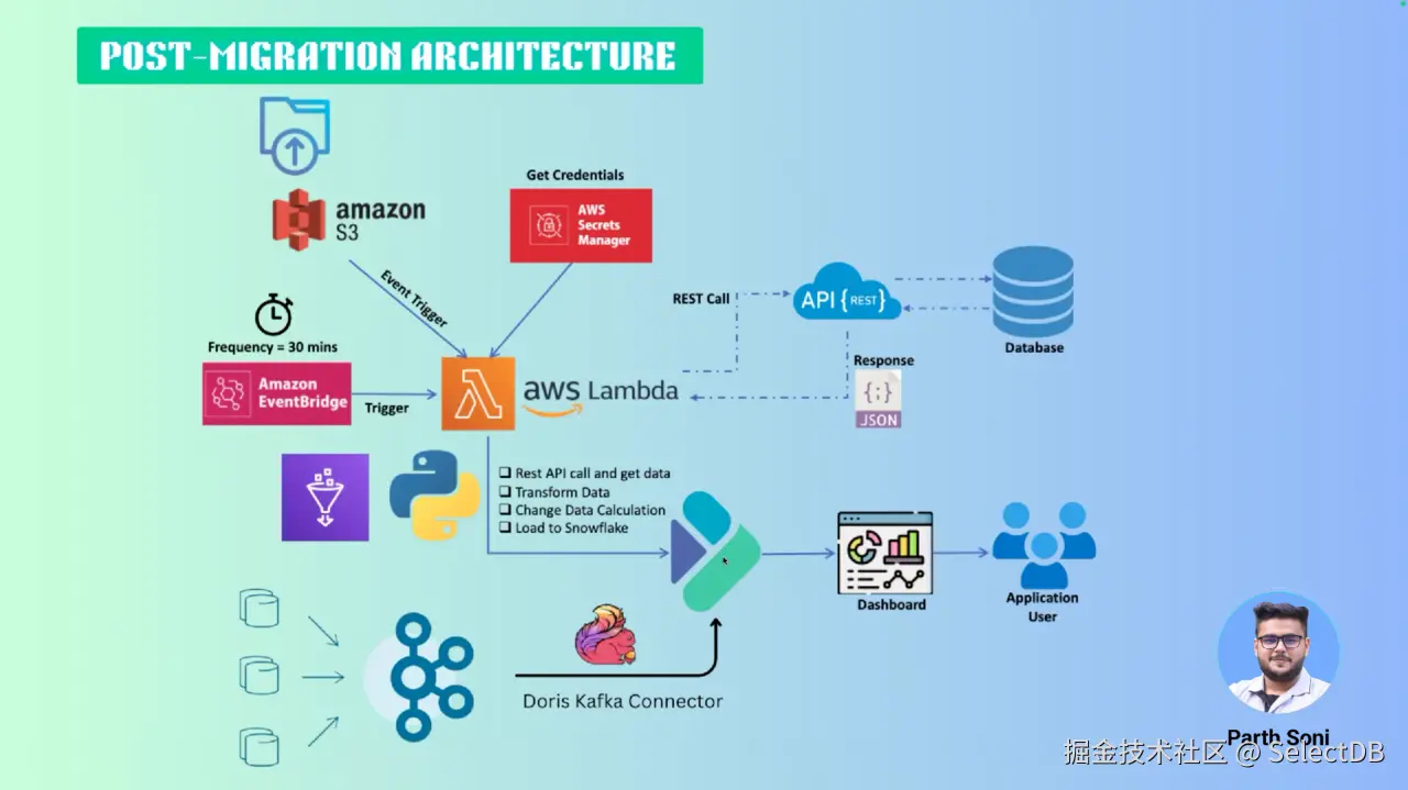 第二阶段:数据导出与加载 数据首先以 Parquet 格式从 Snowflake 导出并暂存于 S3,随后通过基于标准 MySQL 语法的 LOAD DATA INFILE 命令批量导入 Apache Doris。严格的数据质量(QA)与审计流程保障了迁移的完整性与准确性。在 ETL/ELT 管道重构中,团队结合 Doris Kafka Connector(Routine Load)、Flink Doris Connector 与 Spark 微批处理,实现了大规模数据回填及与现有流式管道的无缝集成。