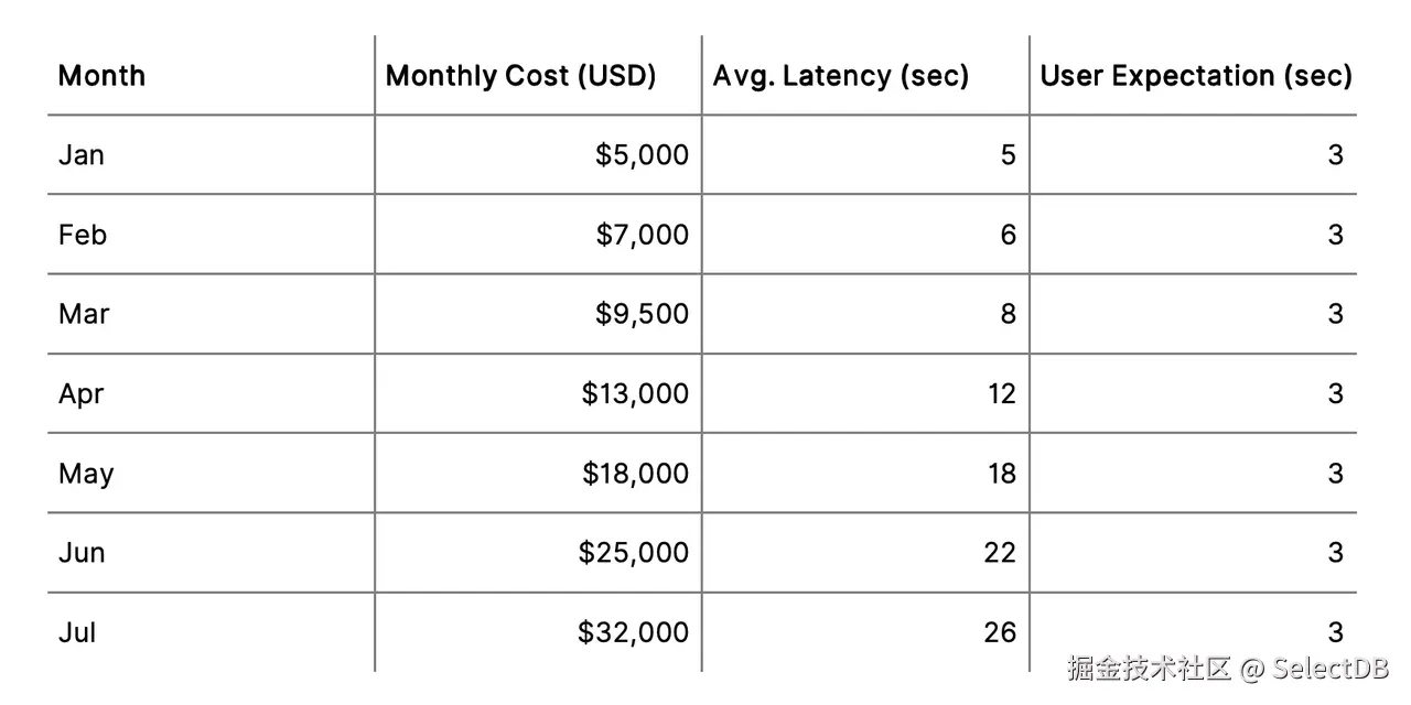 第二张表格则以具体数据支撑了这一趋势,详细列出了每月的成本、延迟及用户期望值,进一步凸显了系统性能与用户体验之间的显著差距。