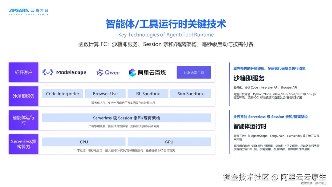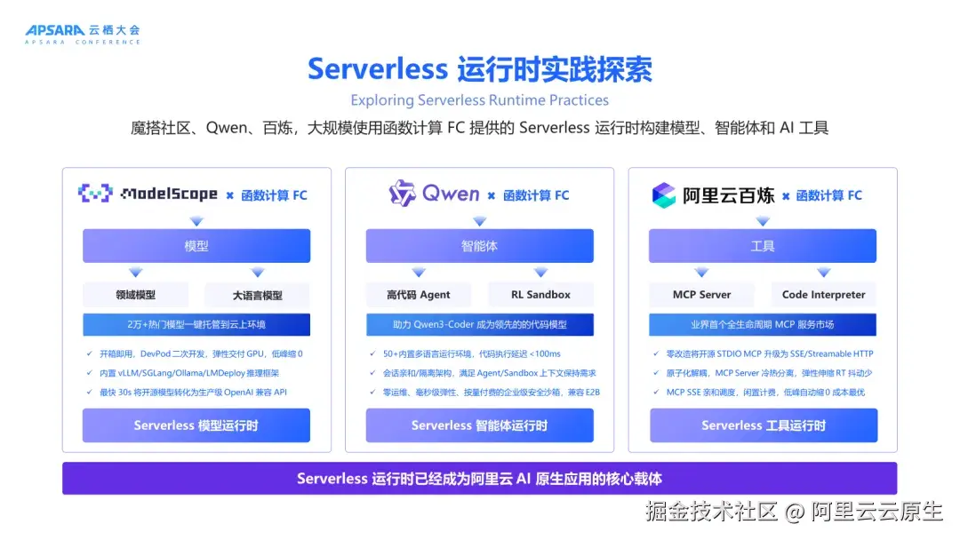 这三大运行时均基于函数计算构建,为开发者提供 0 运维、极致弹性、成本最优的 AI 原生基础设施,并联动阿里云、通义实验室、魔搭社区等生态,全面加速 AI 应用创新。