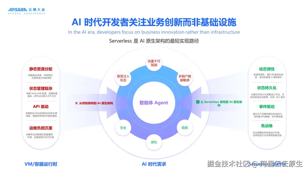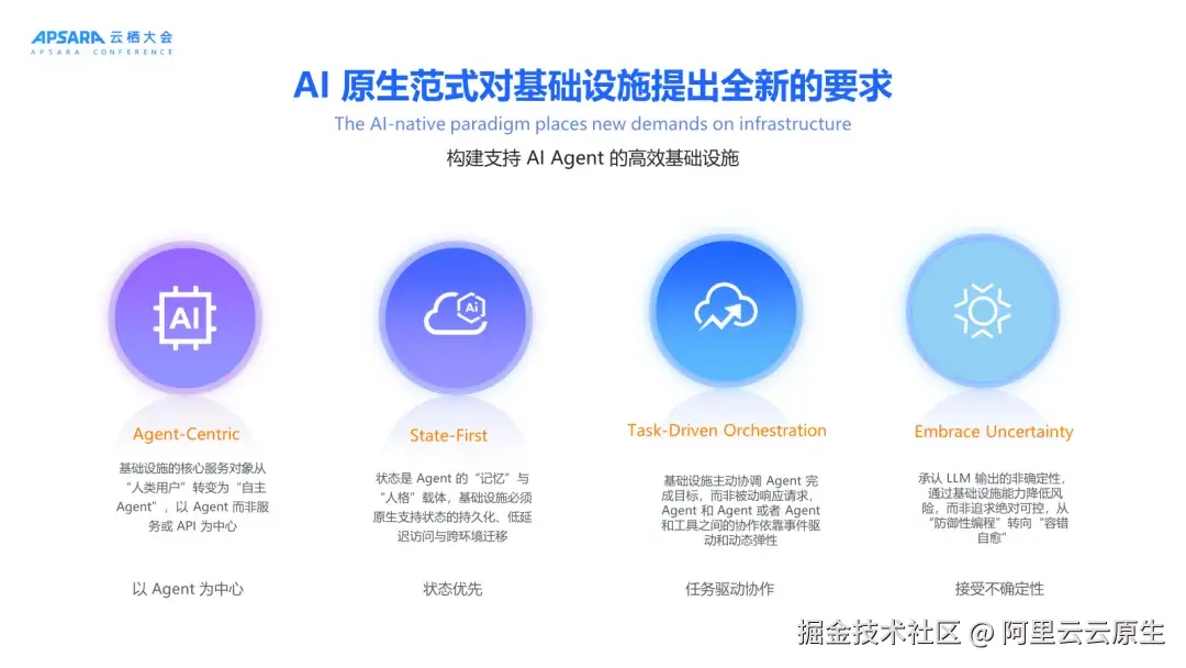 - 传统 API 驱动模式已无法满足 Agent 自主决策、主动执行任务的需求。AI 原生开发需围绕 Agent 生命周期设计,强调任务驱动协作而非被动响应。