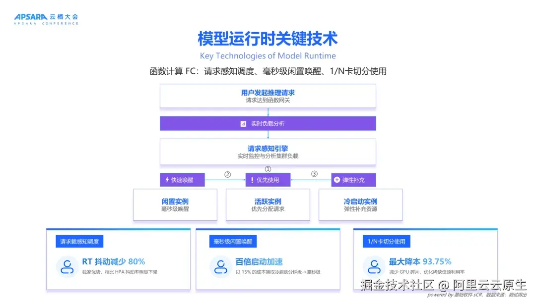 支持超 20,000 + 热门开源模型一键部署为生产级 API。通过异构算力池、请求感知调度、毫秒级闲置唤醒、1/N 卡切分技术实现实时/准实时推理场景冷启动加速,实现 RT 抖动减少 80%,最高降本 93.75%。