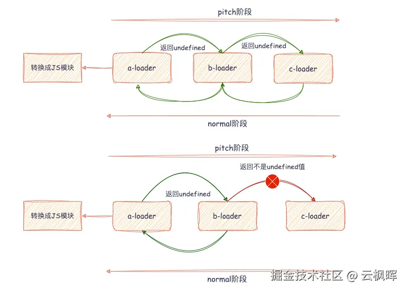 pitch阶段没有发生短路,Webpack将读取模块原始内容,作为后续处理的输入 - 进入Normal阶段,从右到左执行(最后一个loader最先处理,第一个loader最后处理)