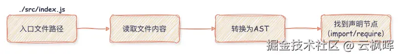 根据配置entry的入口路径读取入口文件内容,使用JS解析器(如acorn)将文件内容转换为AST(抽象语法树),遍历AST识别依赖声明,找到所有ImportDeclaration和CallExpression(callee.name为require)的节点。