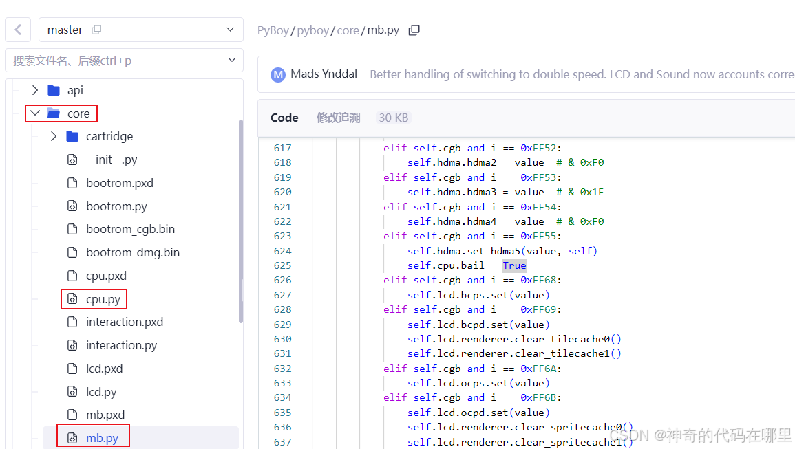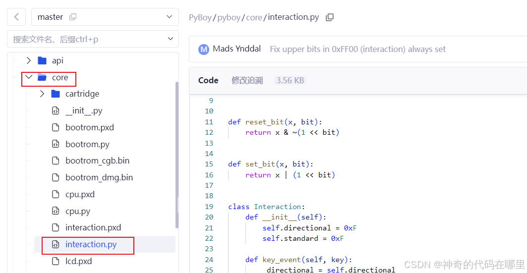 模拟器还包含了系统定时器的模拟,许多游戏依赖它来计时。同时,PyBoy会捕获键盘或手柄的输入事件,并将其映射为Game Boy的十字键和A、B、选择、开始按钮事件。这里主要涉及源码里面core中的interaction.py文件。