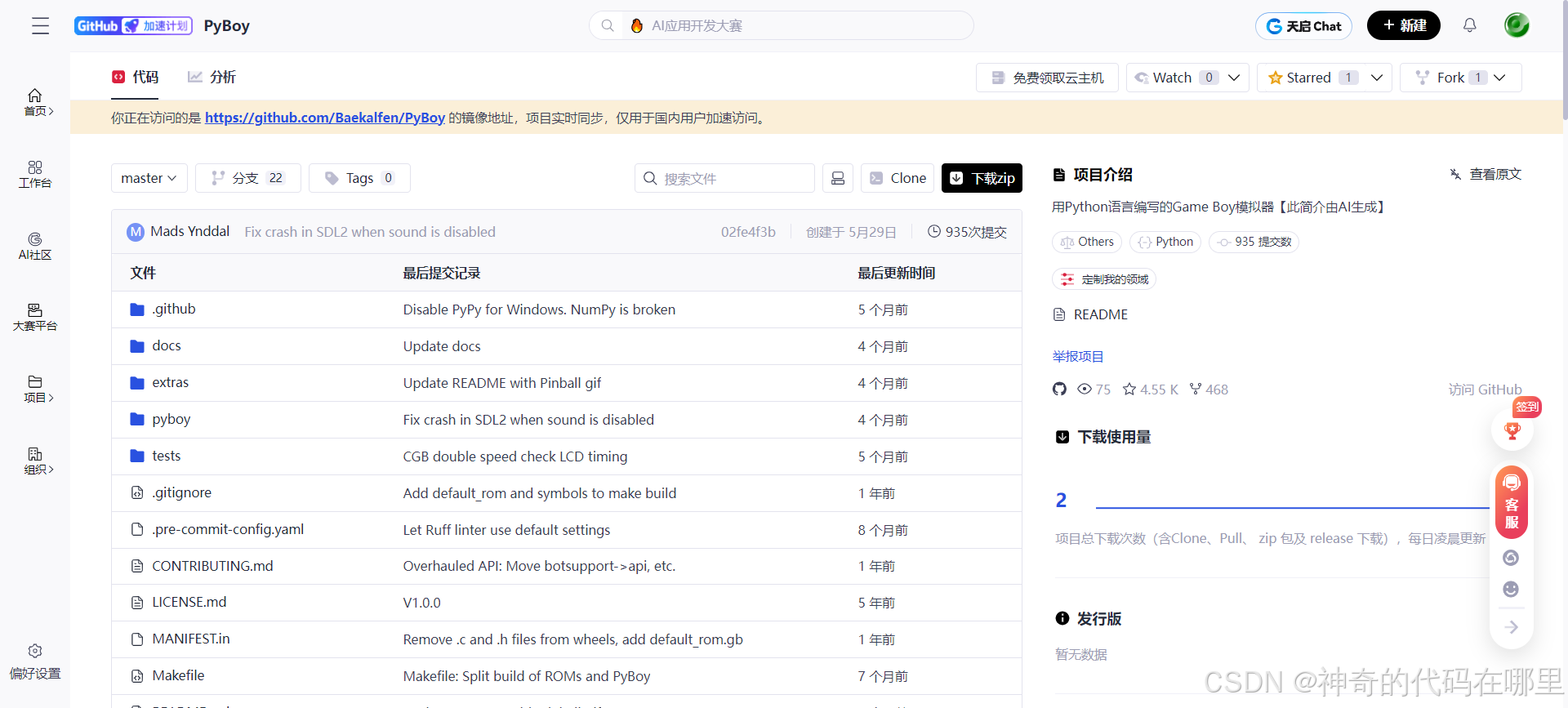 Pyboy是个开源的项目我们可以从国内的GitCode网站上找到这个项目,https://gitcode.com/gh_mirrors/py/PyBoy