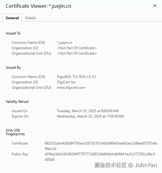 一个典型的DC证书,包括身份信息(如域名、组织信息)+公钥+CA签名+辅助信息(如有效期、颁发机构、签名算法)等内容(图为掘金社区网站的证书内容)。