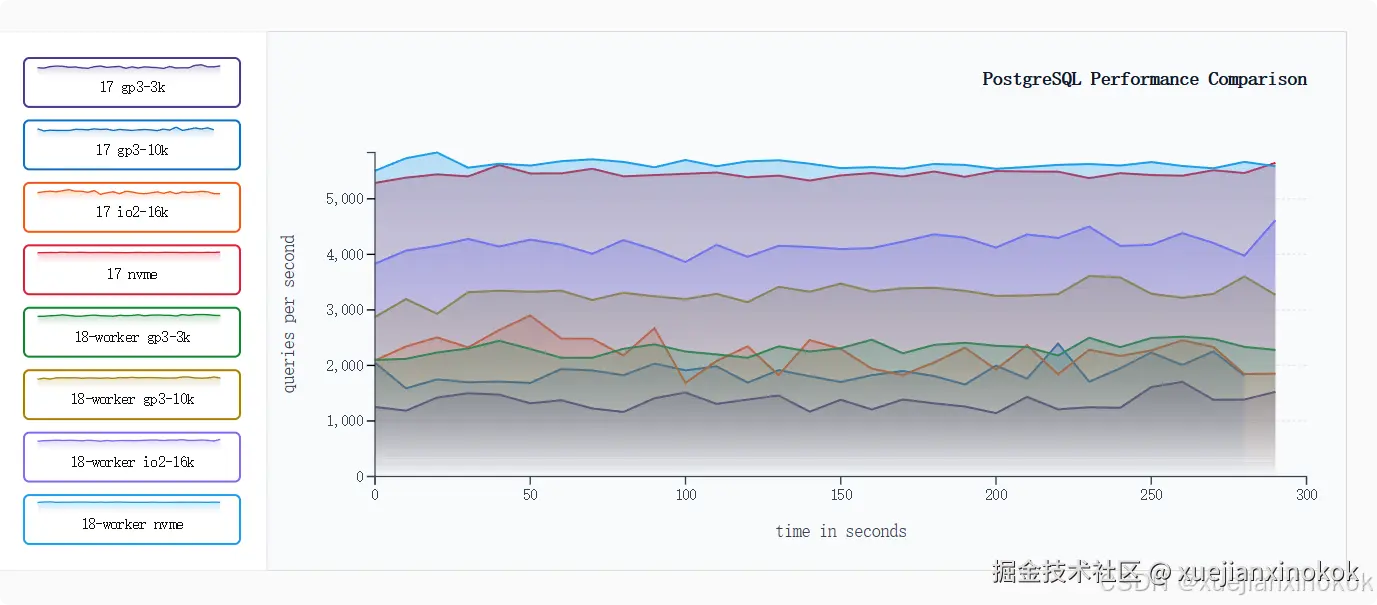 下面是一个交互式视觉效果,比较了所有实例类型的 Postgres 17 结果与 Postgres 18 上表现最佳的 workers。单击缩略图可在图表中添加或删除线条,并比较各种组合。这是基于 10 秒的采样率。