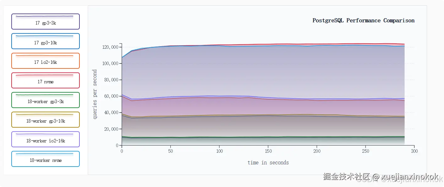 下面我们再次比较 Postgres 17 和 Postgres 18 worker 的结果。单击缩略图可在图表中添加或删除线条,并比较各种组合。