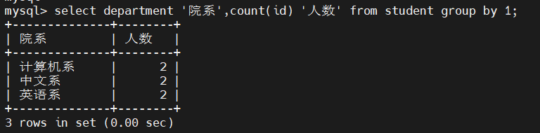 mysql> select department '院系',count(id) '人数' from student group by 1;