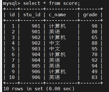 mysql> select name,department,c_name,grade from student a join score b on a.id=b.stu_id