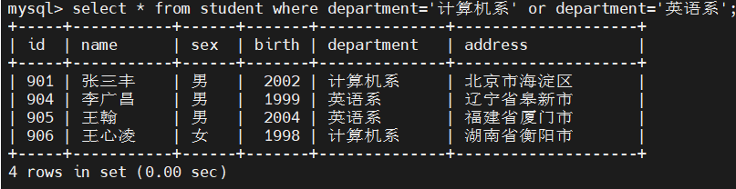 mysql> insert student values(901,'张三丰','男',2002,'计算机系','北京市海淀区');