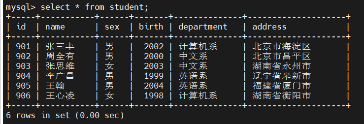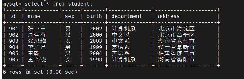mysql> insert student values(902,'周全有','男',2000,'中文系','北京市昌平区');
