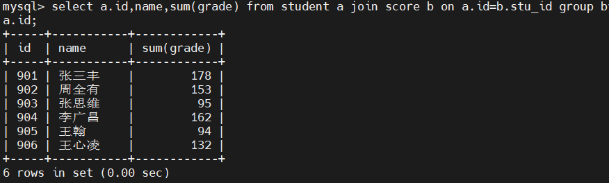 mysql> select a.id,name,sum(grade) from student a join score b on a.id=b.stu_id group by a.id;