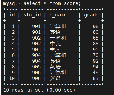 mysql> select a.*, c_name,grade from student a join score b on a.id=b.stu_id;