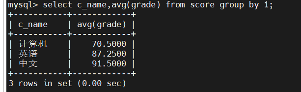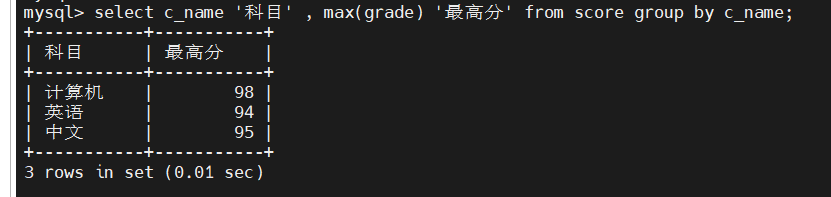 mysql> select c_name '科目' , max(grade) '最高分' from score group by c_name;