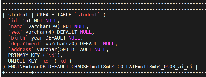 mysql> create table student(id int(10) not NULL unique primary key, name varchar(20) not NULL,sex varchar(4) , birth year, department varchar(20), address varchar(50));