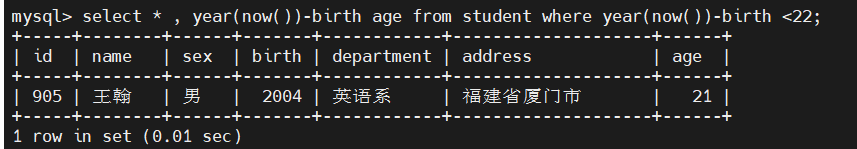 mysql> SELECT * , year(now())-birth age from student where year(now())-birth <22;