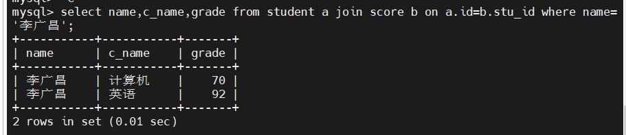 mysql> select name,c_name,grade from student a join score b on a.id=b.stu_id where name='李广昌';