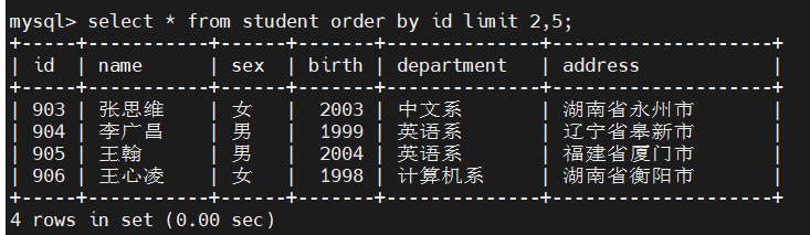 mysql> insert student values(903,'张思维','女',2003,'中文系','湖南省永州市');