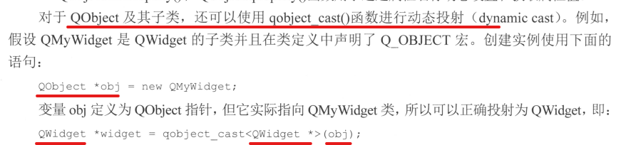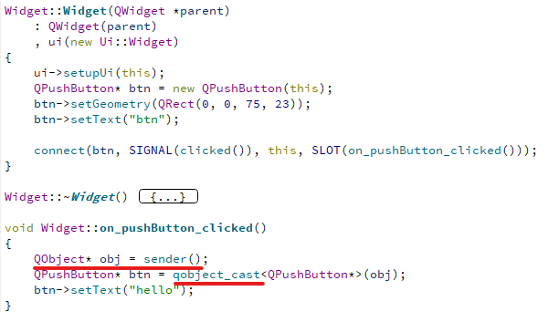 为什么使用投射,从以下例子看出,因为使用sender()获取发送者时,sender()返回类型为QObject,而我们需要转换为QPushbutton类型才能执行setText,需要将QObject转换为QPushbutton,从基类转换为派生类,所以需要用投射qobject_cast转换 **
