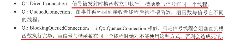 BlockingQueueConnection:当信号与槽函数在同一个线程使用这种方式时,由于发信号相当于加入到一个队列里,然后此线程开始阻塞等待槽函数执行完毕,但由于槽函数也是这个线程,而这个线程正在阻塞无法执行槽函数,所以就死锁了