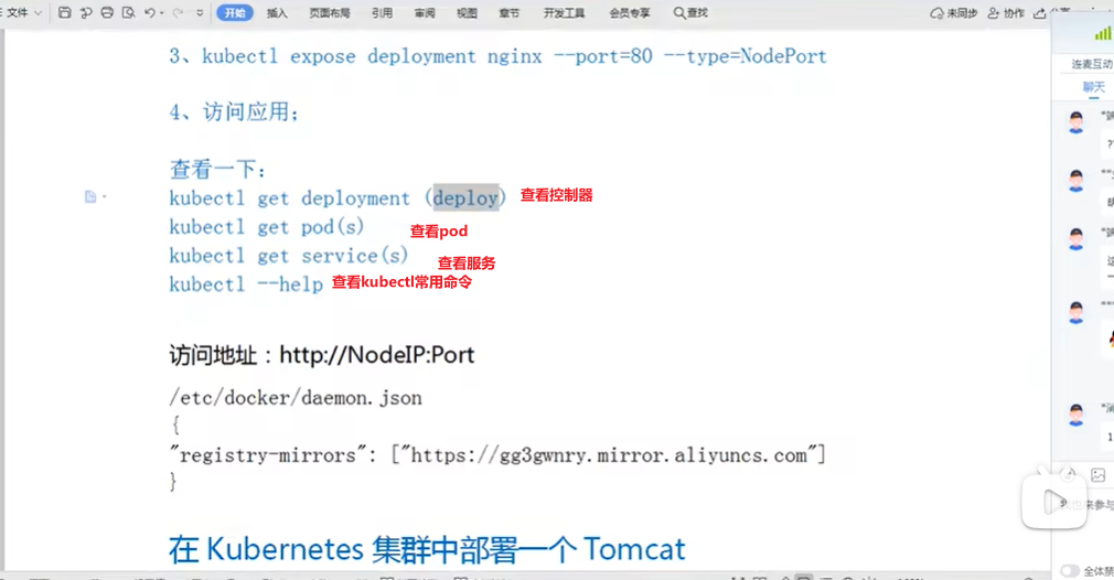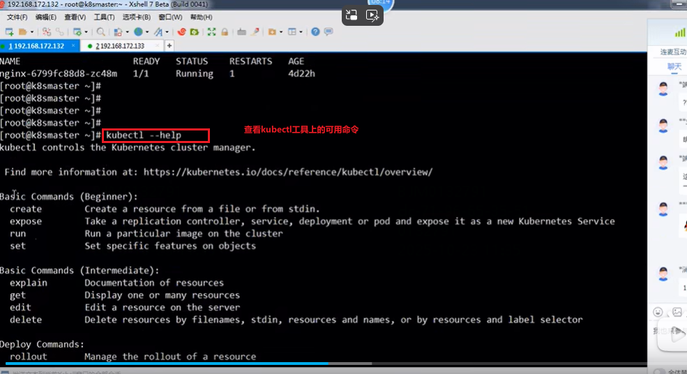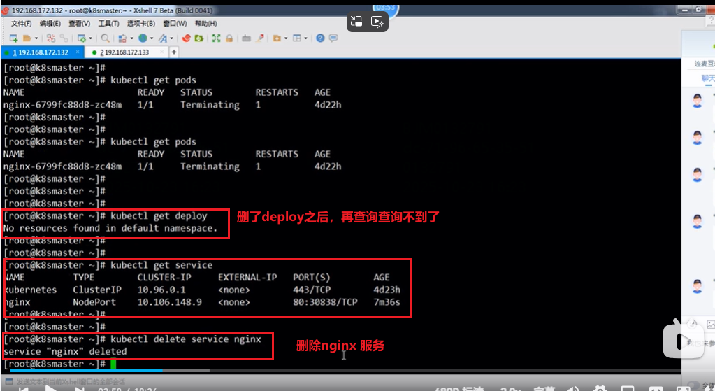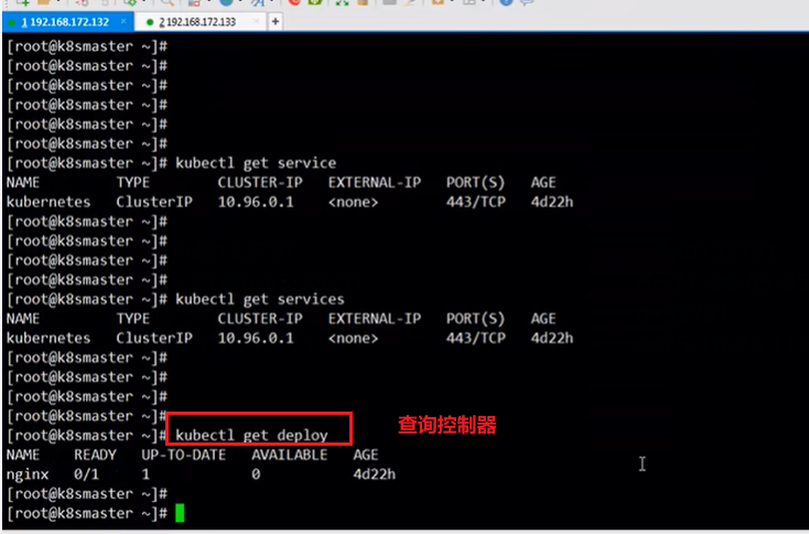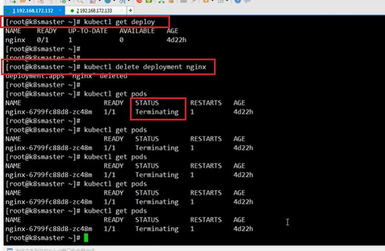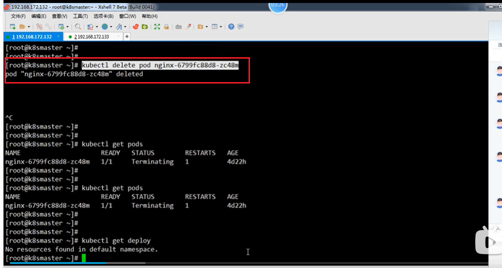 删除deployment:kubectl delete deployment 控制器名称,如kubectl delete deployment nginx,删除nginx控制器,再通过kubectl get deploy查询控制器可以发现nginx会查询不到。一般把控制器删了之后,pod也会被删,视频上是Pod的状态是终止Terminating