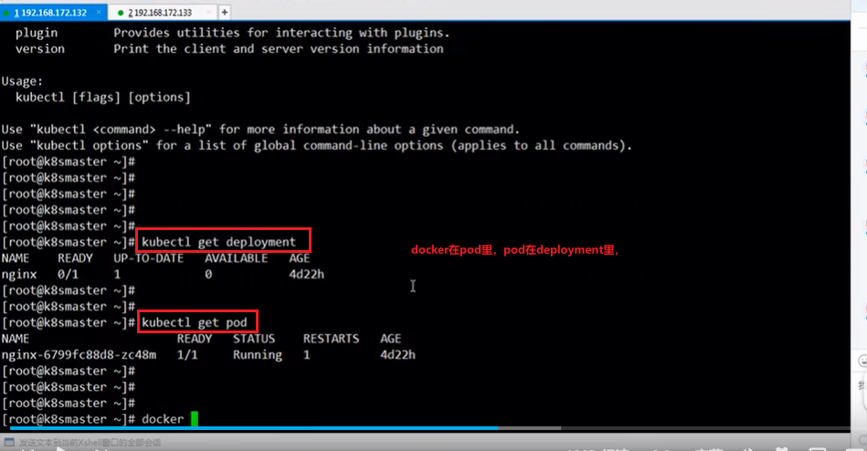 master节点是管理角色,实际运行的pod或deployment或者docker容器实际运行在node工作节点,即在master节点运行docker ps查询nginx镜像,实际上是查询不到的,而master节点是启调度作用,假如node工作节点有多个,则master会根据调度器把pod创建在某个node工作节点上