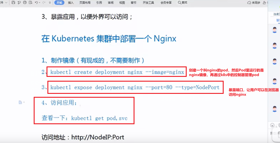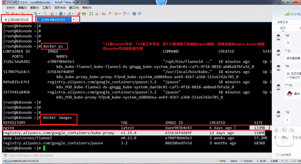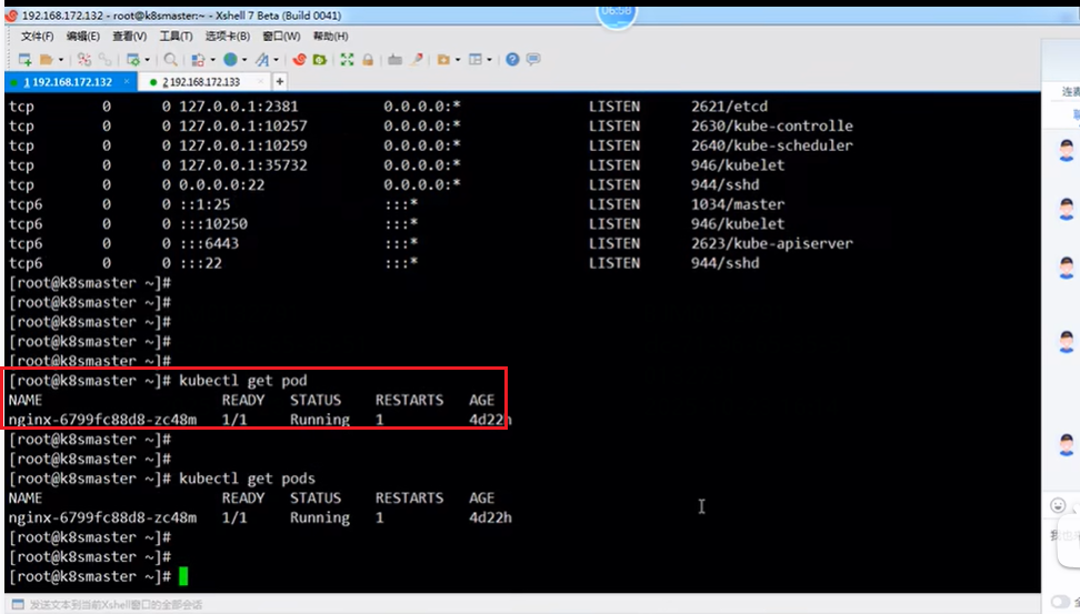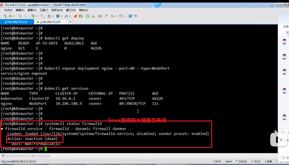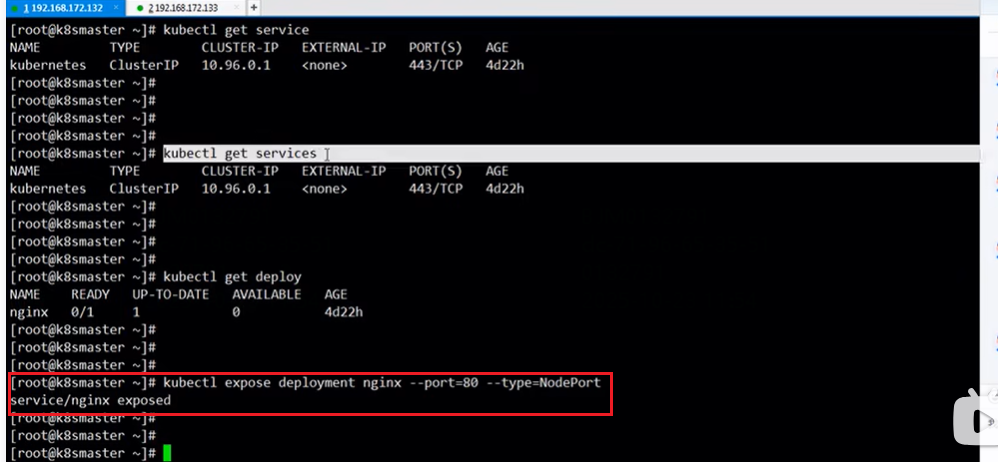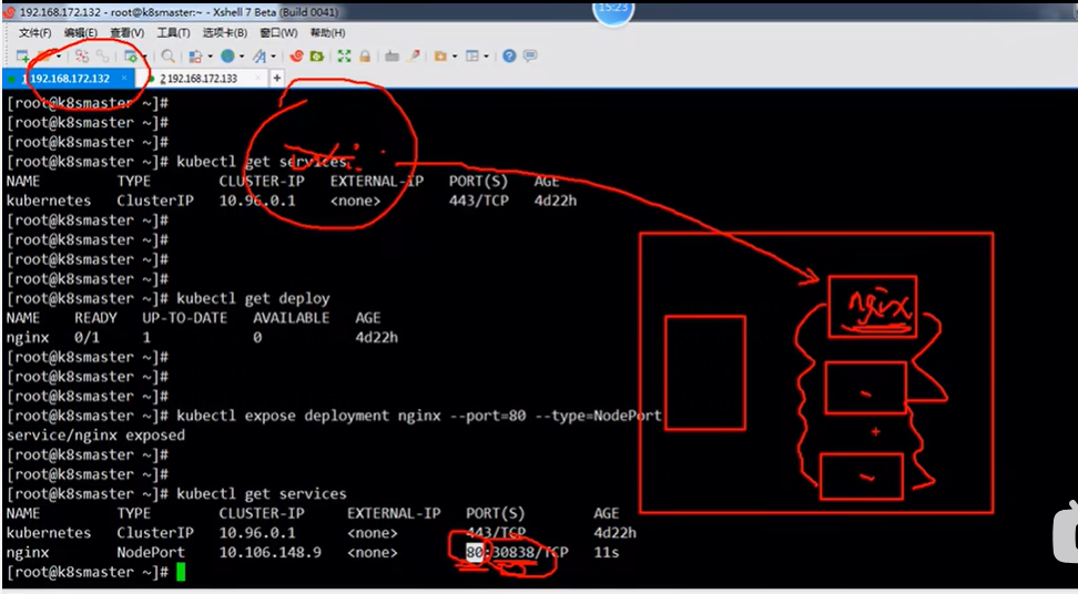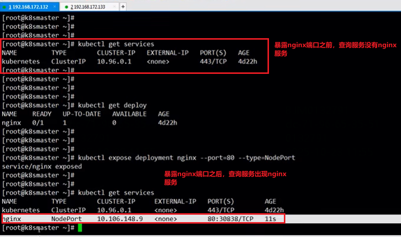 如下第3张图,在kubectl get services命令下,倒数第2列PORT(S)列有2个端口80:30838,80端口是node工作节点内部之间通信的时候用的端口,30838端口是用户在浏览器使用的端口。假如说1个master节点对应3台node节点,node节点之间相互通信时用80端口,当用户在浏览器访问容器里的nginx的时候用30838端口,实际nginx部署在了node节点即133地址,所以在浏览器访问的时候用http:133node节点地址/nginx:30838