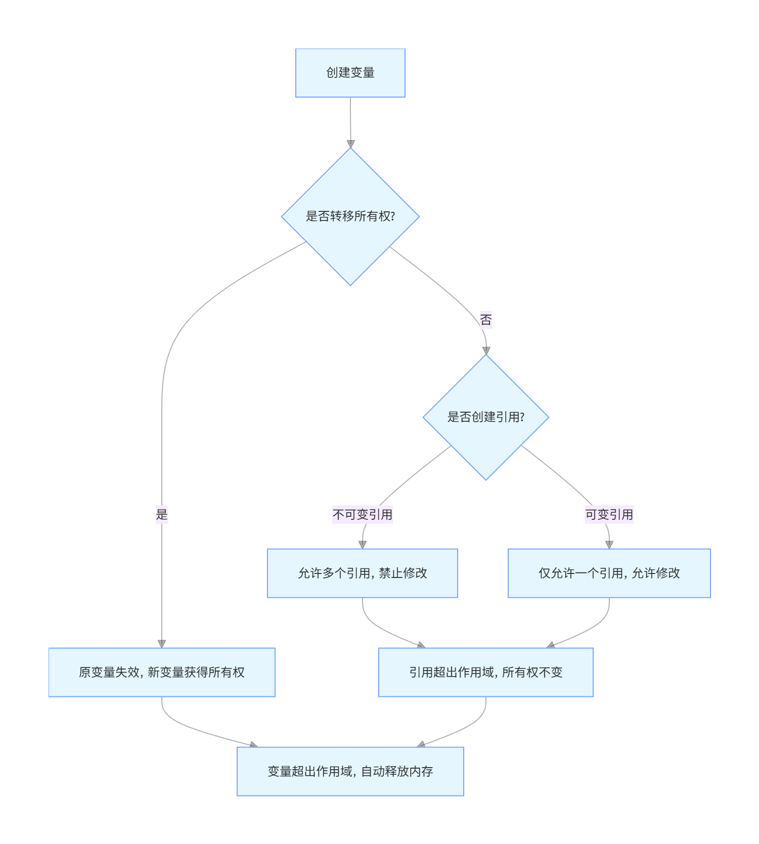 - 所有权规则:每个值有且仅有一个所有者,离开作用域自动释放