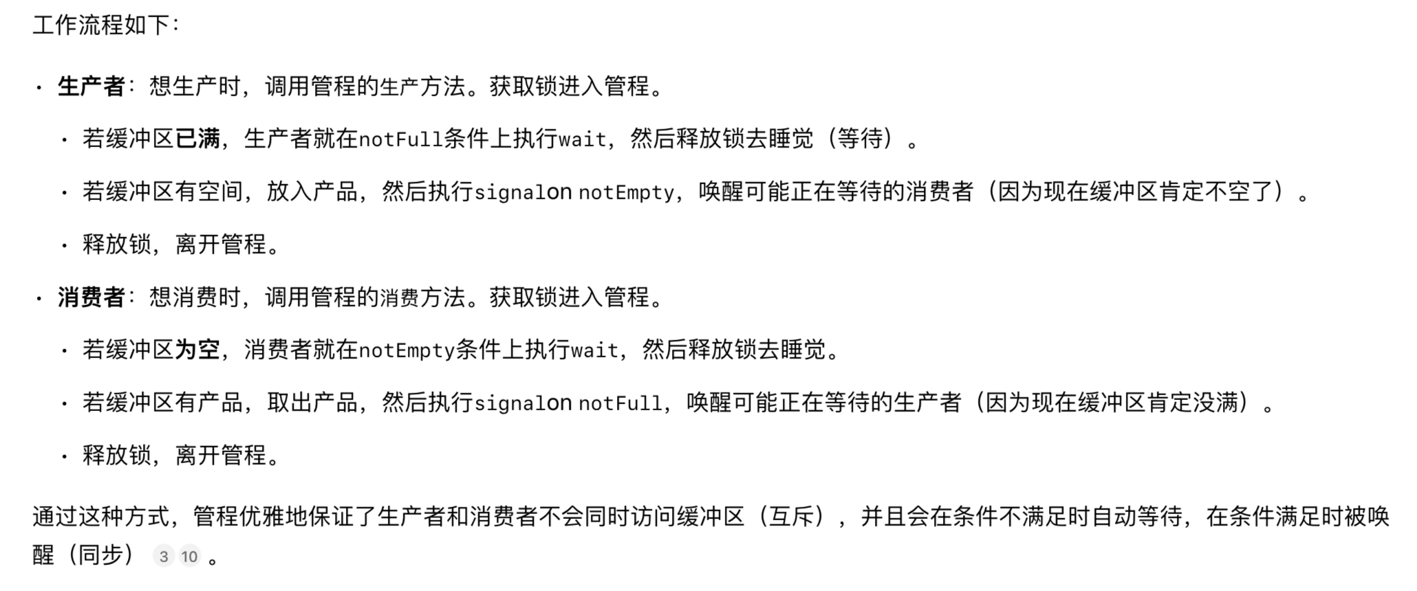 - 条件同步 :这是管程的精妙之处。如果一个线程进入管程后,发现它执行操作所需的具体条件 还不满足(比如生产者发现缓冲区已满),它不会占着位置不走,而是会针对一个条件变量 (如notFull)执行