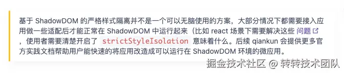 其原理是shadow dom,可以有效对样式进行隔离,但在react场景下,开启后会导致事件失效,所有的事件回调无法执行,严重影响系统功能;这一点在qiankun官方文档中亦有提及。