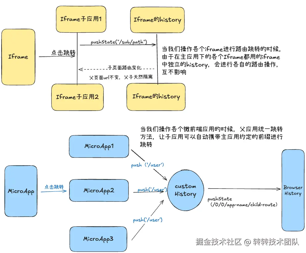 在 Iframe 模式下,内嵌页面拥有"浏览器级"的完整上下文,直接调用 history.pushState/replaceState 或框架层的 router.push/router.replace 就能独立驱动地址栏变化,每个 Iframe 的 URL 与父页面天然隔离,彼此互不干扰。