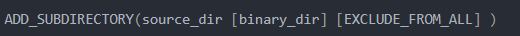 这个指令用于向当前工程添加存放源文件的子目录。并可以指定中间二进制和目标二进制存放的位置。EXCLUDE_FROM_ALL参数的含义是将这个目录从编译过程中排除,比如,工程中的example,可能就需要工程构建完成后,再进入example目录单独进行构建(当然,你可以通过定义依赖来解决此类问题)。