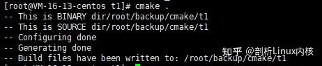 在目录下建立一个build文件用来存储cmake产生的中间件,不过需要使用cmake ...来运行。其中外部编译,PROJECT_SOURCE_DIR仍然指代工程路径,即/backup/cmake/t1,而PROJECT_BINARY_DIR指代编译路径,即/backup/cmake/t1/build。