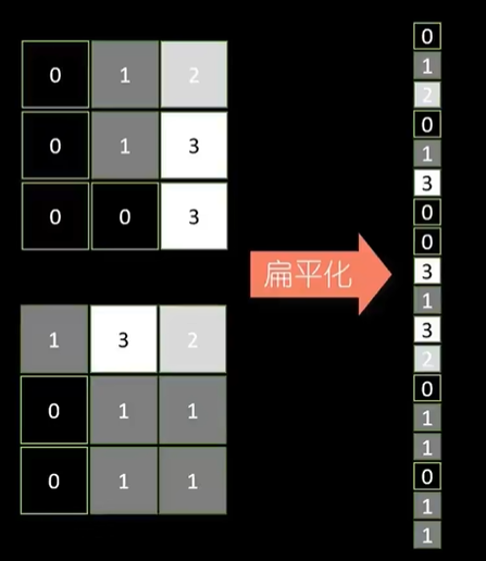 把池化后的数据进行扁平化处理,转化为1维的数据条,数据条录入到后面的"全连接隐藏层"