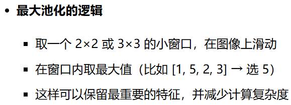 - 池化层通过「最大池化(Max Pooling)」或者「平均池化(Average Pooling)」缩小数据,类似于「压缩图片,但保留主要内容」。